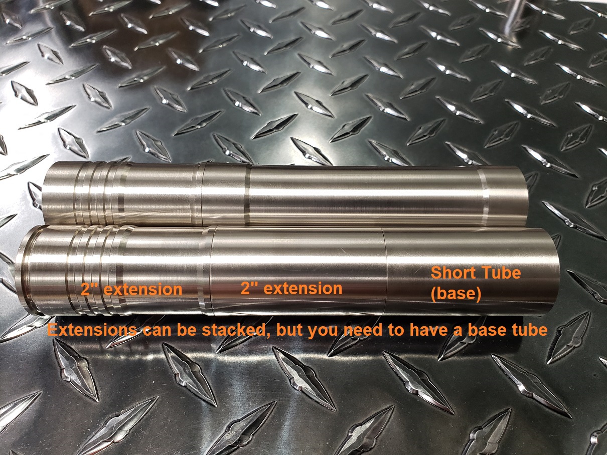 Extension tube Male Threads are 0.300″ long, same length as flanged cap threads so its an easy swap and keep riding. Fitment note: These extensions will not work with a flangeless cap setup. They will only work with the flanged caps which have a flange that seats against the tube end and the threads protrude 0.300″ into the tube- same length of threads as on the extension. The flange must seat fully against the tube end or you will be loosing pressure!