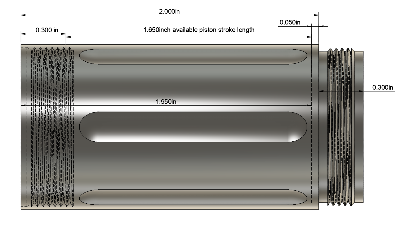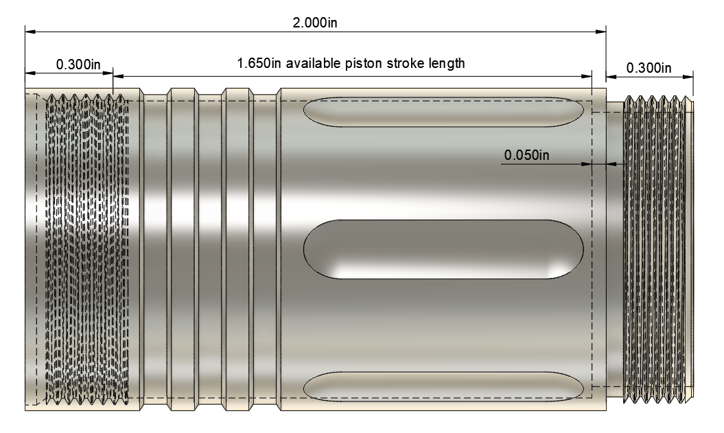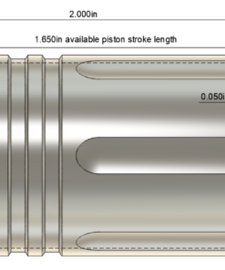 - 2″ model adds 2″ to length, has 1.650″ of usable piston stroke length
